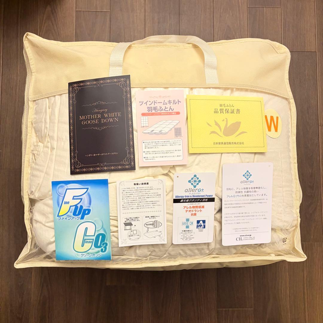 ポリエステルと綿の側地、ダウン90%の高品質掛け布団。- 商品名: 立体羽毛布団- 品番: E052-1SW- 側地: ポリエステル 85% / 綿 15%- 中綿: ダウン 90% / フェザー 10%- 中綿重量: 約12kg- 製品サイズ: 約150cm x 210cmご覧いただきありがとうございます。新品未使用です。カバーはありませんので、別途、お買い求め下さい。衛生上、袋から出しての撮影は控えさせて頂きます。